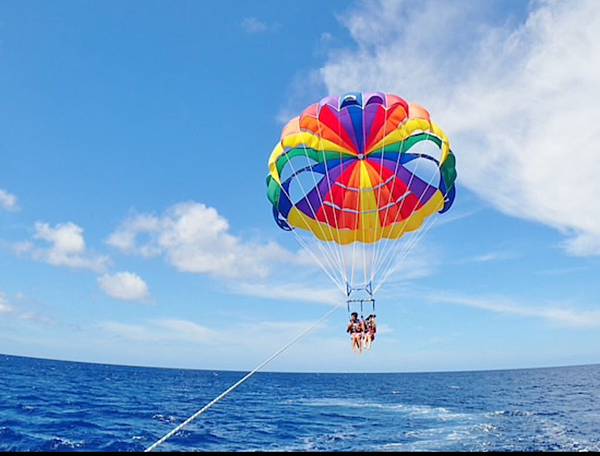 原訂最後一天要睡飽飽然後去國際通吃個飯再逛一下,接著去outlet然後還車,去機場⋯⋯但因為船開走了,所以第四天我們幾乎是跳起床,因為深怕又再度跟船錯過⋯⋯可惜了vessel的早餐,我才吃一盤就草草結束!又開上高速高路,這次比預定時間提早抵達,寫完基本資料後就穿救生衣準備上船,但船看起來離沙灘有段距離,正想著要怎麼過去的時候,帥氣的服務人員就騎著水上摩托車拉著一條香蕉船過來了⋯⋯可惜下水前櫃檯說手機會弄濕,所以不要帶,結果根本沒有機會可以弄濕,好可惜無法紀錄!只好用官網的活動照片來回憶一下。今天的船只有我們跟另外兩個可愛的日本女孩,一上船就會先套上安全帶,船開到某一個地方後,船長開始整理拖曳傘,這真的是一個很困難的工作,因為要測風向,又有一堆繩子要拉扯,好不容易整理完就換我們,比我想像中簡單很多,坐在甲板上,然後船往前開,就會慢慢升空了!其實剛上去還蠻恐怖的,但到了一個高度,就可以很自在的享受在天空翱翔的感覺。